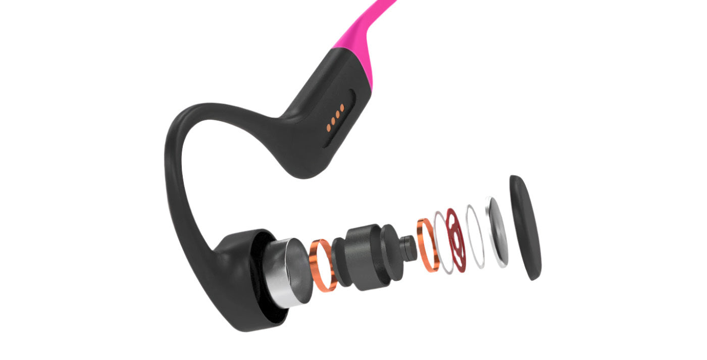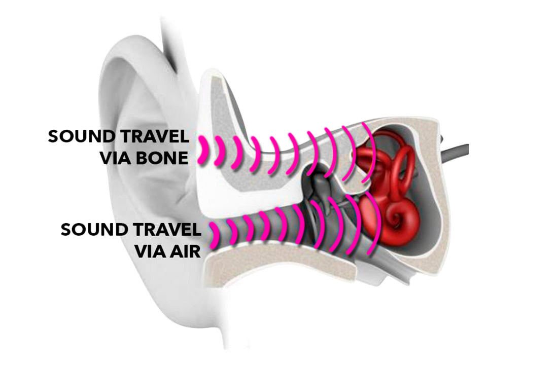 Bone Conduction is different - it sends vibrations into your skull bones, bypassing your eardrum, and transmits them directly to your inner ear, where the brain interprets them as sound.
